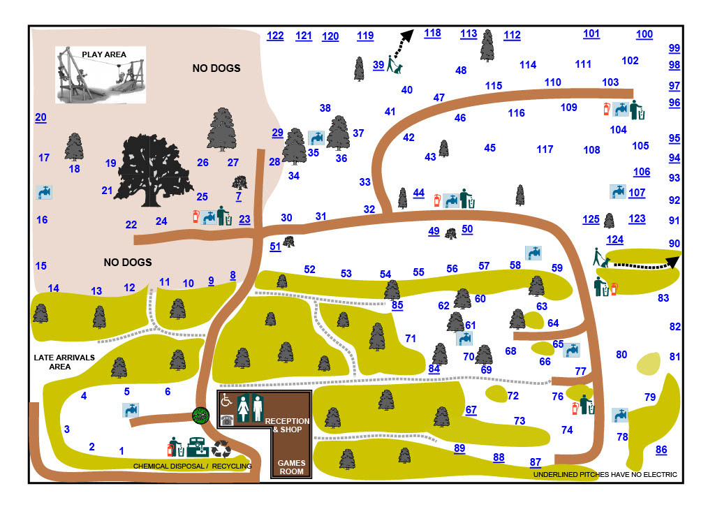 Have a look at the pitch layout and relevant pictures. The left half of the main park, which includes the play area, is a designated No Dogs area.